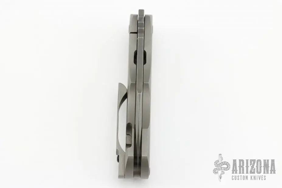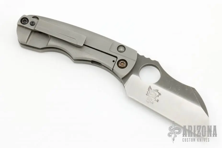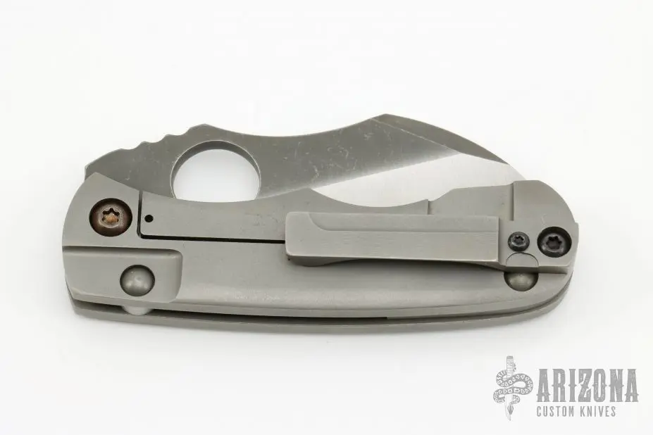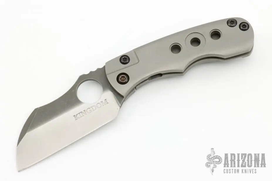 This custom Griffon folder by Kingdom Armory features a two-tone finished blade with notched thumbrest and a thumbhole. The handle bead blasted milled titanium frame, clip, and backspacer. Includes a Velcro case. Nice detent, lockup and blade seating. Has some light scuffs otherwise excellent condition.