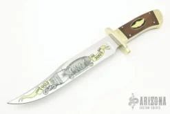 This Commemorative Harley-Davidson Motorcycles Bowie features a mirror polished clip point blade with false top edge, .235″ blade stock and 1.63″ blade depth, hidden tang construction. The handle has a brass guard, and butt, with wood grip and inlay. Comes with display box. Excellent condition.
