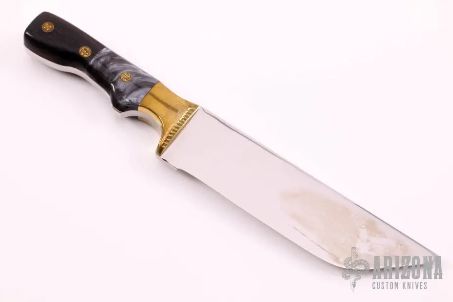 This knife by RLJ Knives features a mirror polished chisel ground blade with notched thumbrest, .240″ blade stock and 1.502″ blade depth, full tang construction. The handle has fileworked brass bolsters, pearlex and ebony wood scales with mosaic pins. Has a few light scratches, otherwise excellent condition.