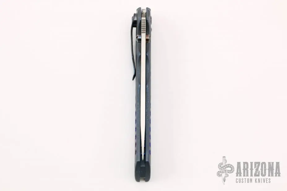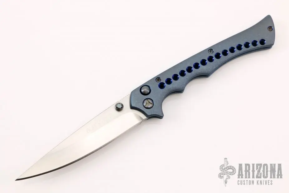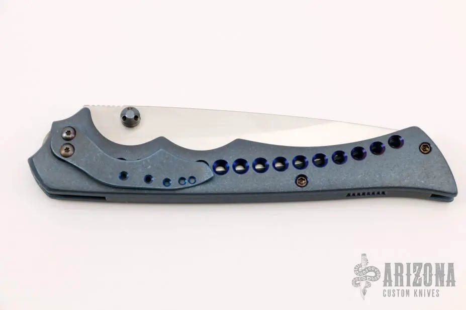 This Henchman Button Lock by Neil Blackwood features a hand rub satin finished blade with notched thumbrest and dual anodized titanium thumbstuds. The handle has a blasted and anodized titanium frame with a matching backspacer and tip down clip, anodized screws, lanyard pin at the butt. Nice lockup and blade seating. Excellent condition. Comes with a velcro case.