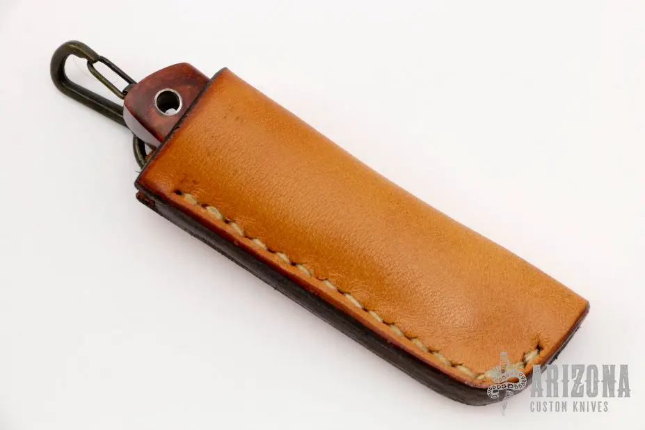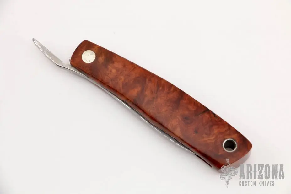This Higonokami by Seiji Yanagida features a Damascus blade. The handle is one piece of padauk burl with lanyard hole. Comes with a leather slip sheath. Excellent condition.