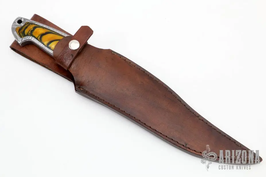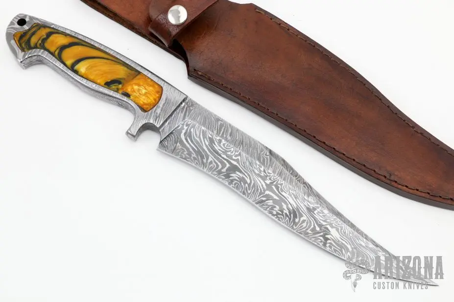 This Knife by SMID Damascus features a Damascus blade with false top edge, .220″ blade stock and 1.869″ blade depth, integral handle with pearlex inlays. Comes with a brown leather sheath. New from maker.