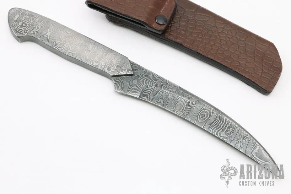 This knife by PJ Ernest features a Damascus blade with .108″ blade stock and 1.102″ blade depth, integral construction. Comes with a leather covered kydex sheath and a zippered case. Excellent condition.