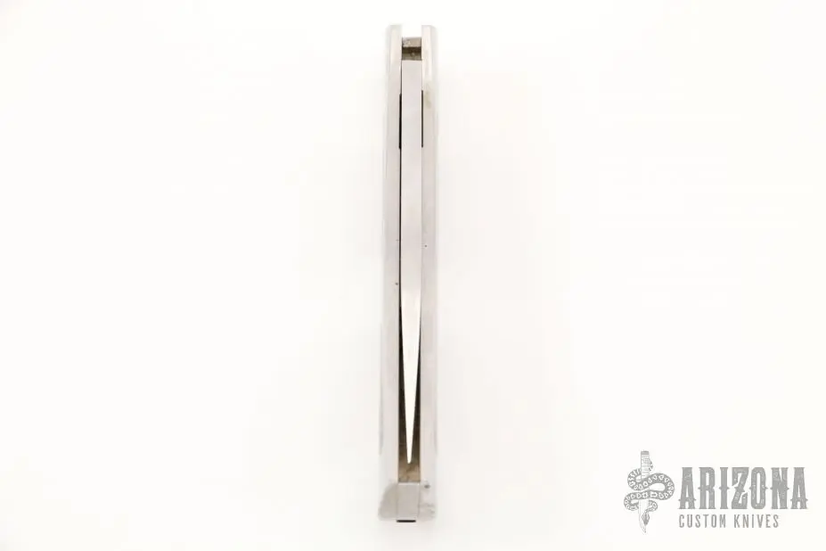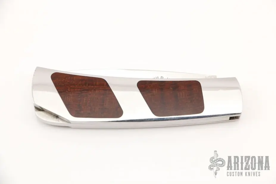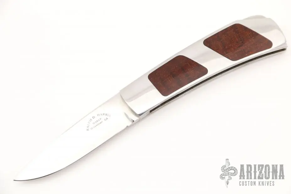This Lockback by Ralph Dewey Harris features a mirror finished drop point blade. The handle has a mirror polished stainless steel frame with wood inlays. #126 on the blade. Has some light scratches, otherwise good condition.