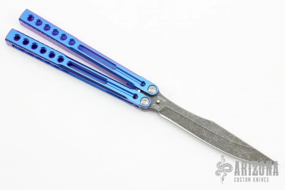 The Invictus Balisong features an acid stonewashed blade. The handles are anodized 6AL-4V titanium with a latchless channel construction design, bushings, phosphor-bronze washers, and hardened steel tang pins. S/N 128. Includes original box and COA. New from maker.