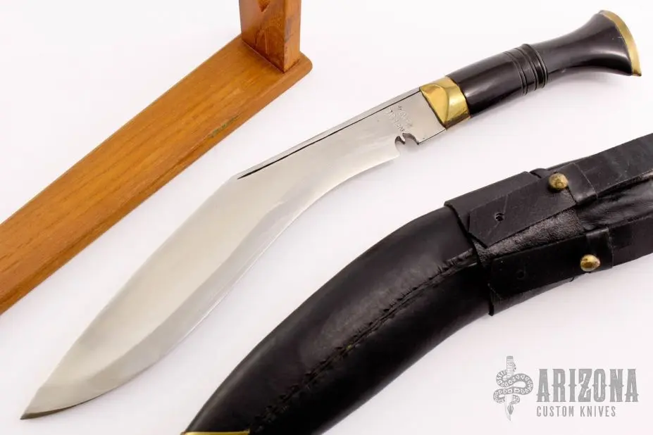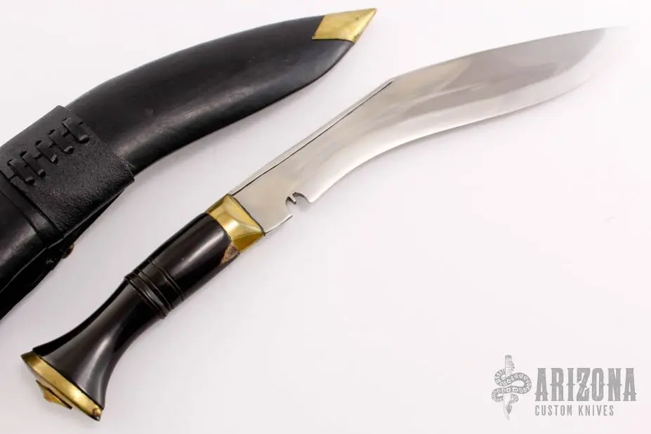 This Kukri Nepal Gurka Knife has a high satin finished blade with small fullers, .360″ blade stock and 1.725″ blade depth, hidden tang construction. Handle has a brass bolster and butt plate, buffalo horn grip. Comes with black leather covered wood scabbard. Dated 2004 on the blade. Has a few light scratches, otherwise excellent condition.