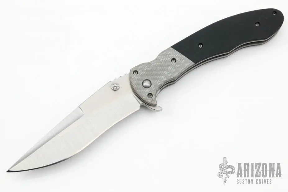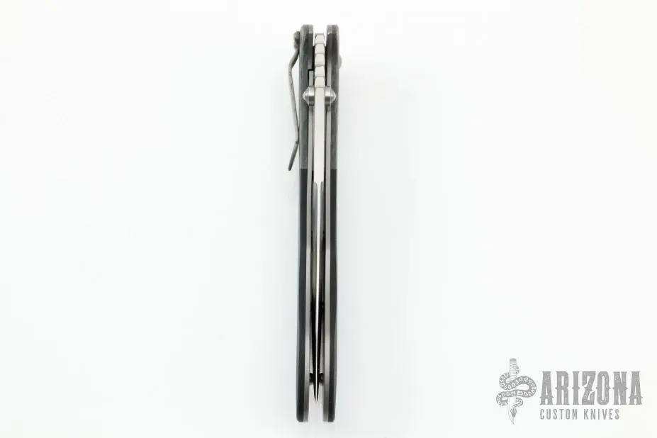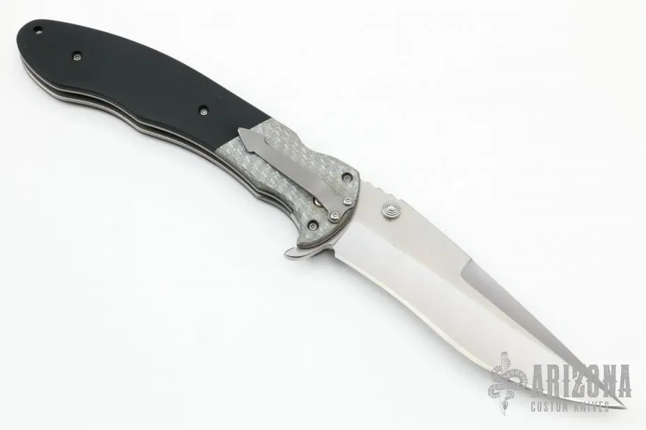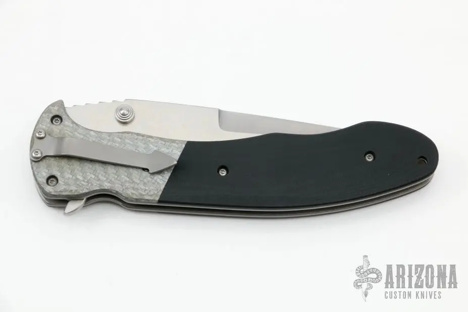 This Monster flipper by Brad Duncan features a satin finished blade with dual thumbstuds and false top edge. It has a bead blast titanium frame, silver twill bolsters and g10 scales. Bead blast stainless steel tip down clip. Smooth and fast flipper opening that requires no wrist action. Nice detent, and blade seating. Has some blade wobble. More vertical than horizontal. Has some scuffs and scratches on the frame, otherwise good condition.