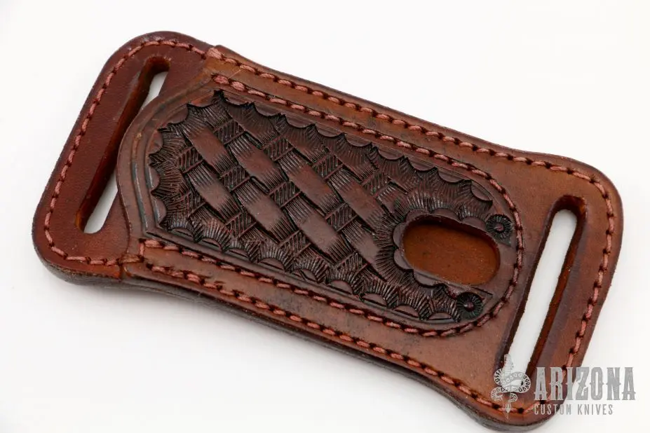 This cross draw sheath by A&M Leather is handcrafted from top quality leather, hand tooled. Has hole in the bottom of the sheath to push the knife out easier. Made primarily for slipjoints. Very well-made. New from maker.