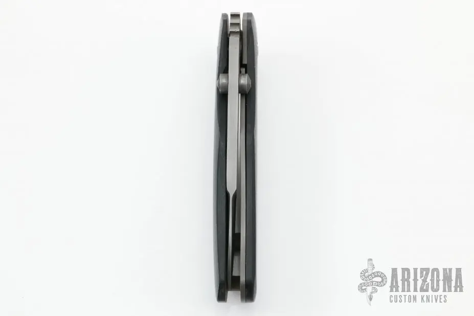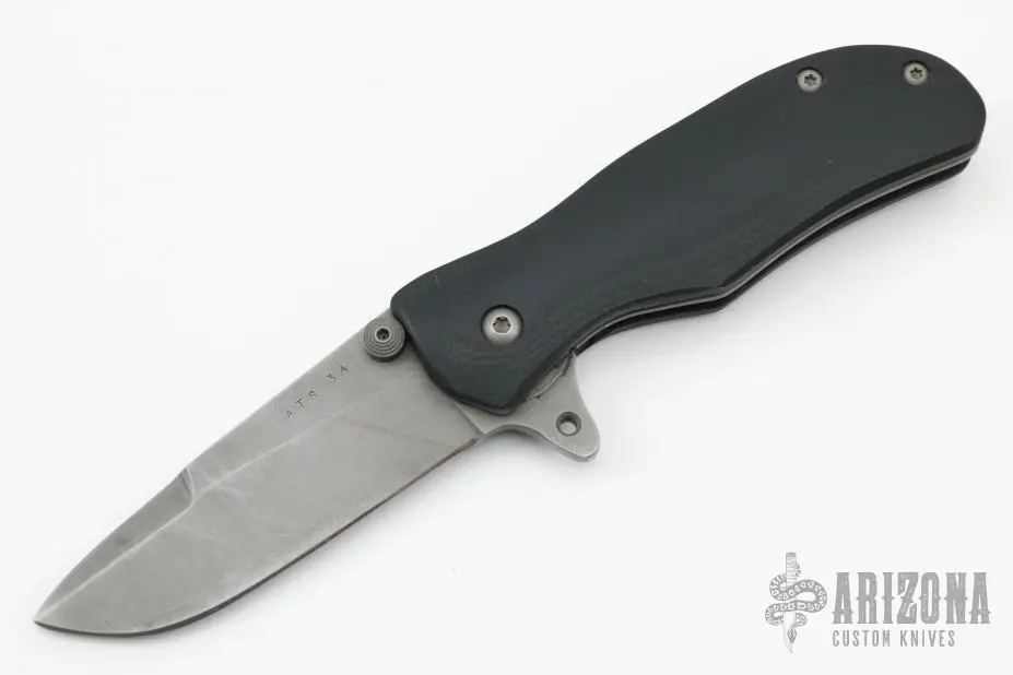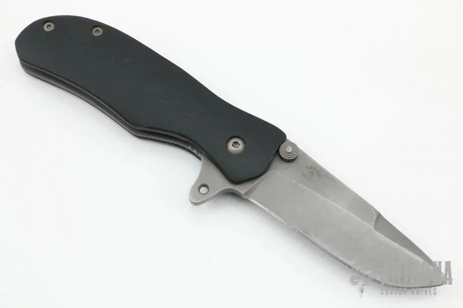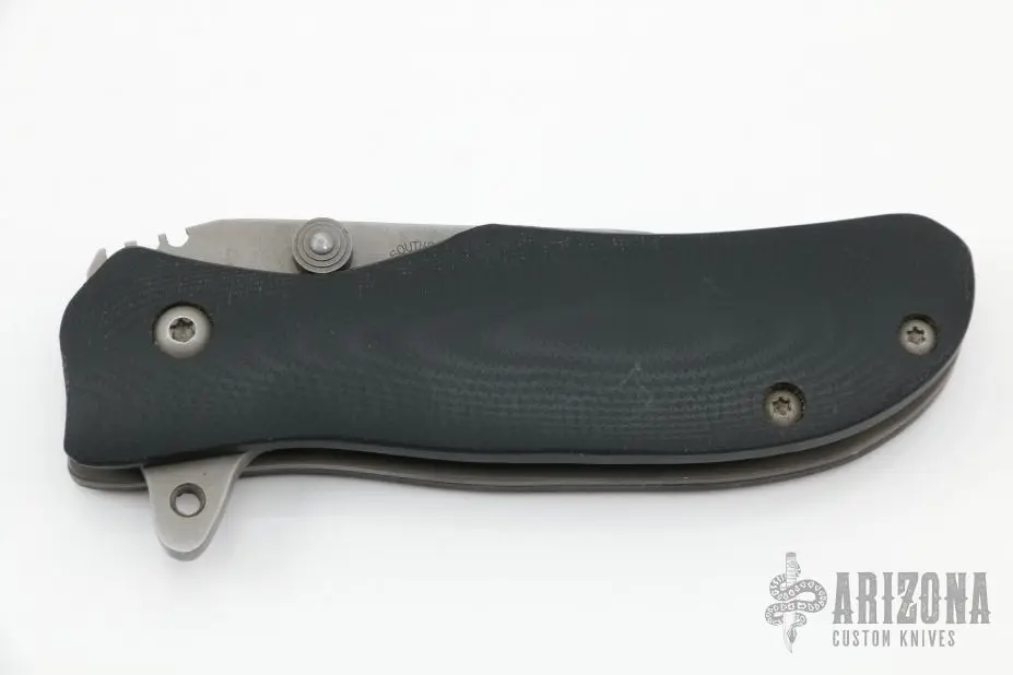 This left handed linerlock flipper by Southpaw Knives features a bead blast finish clip point blade with a notched thumbrest and a false top edge. The handle has black micarta scales, and a titanium liners. Has some scratches and scuffs, lacks refinement, otherwise good condition.