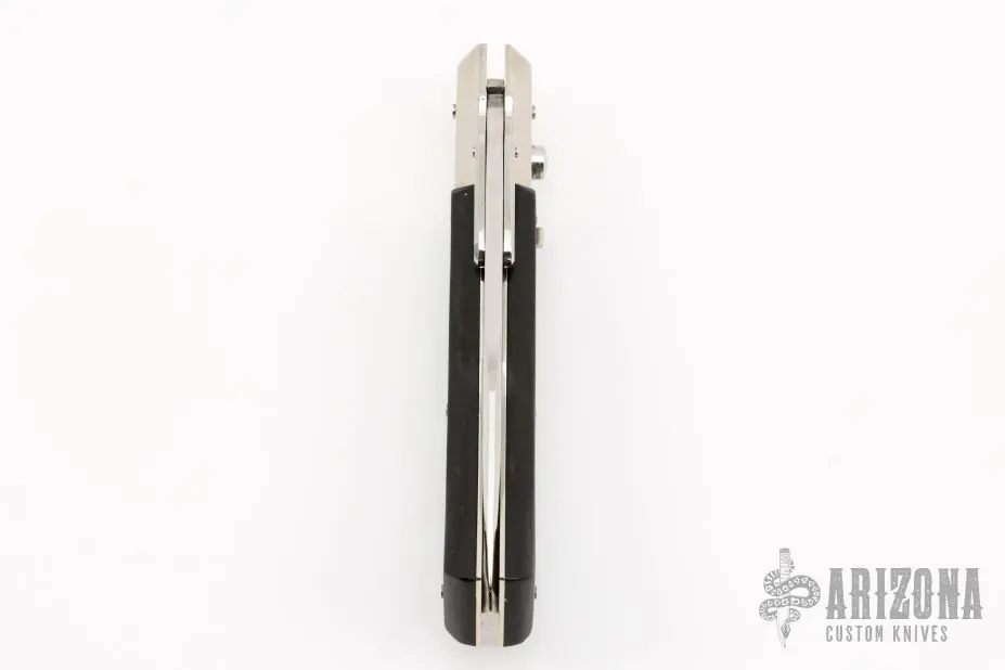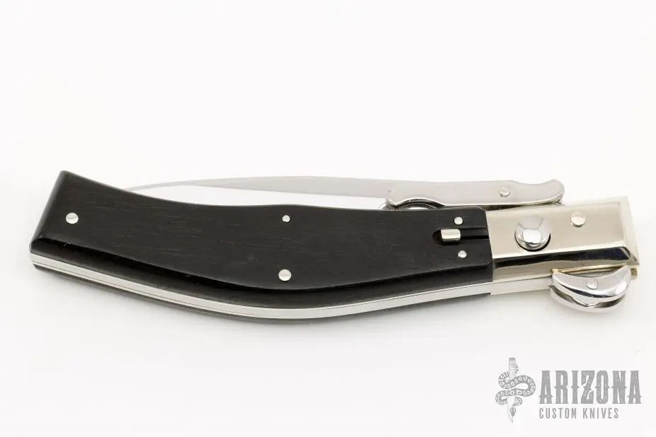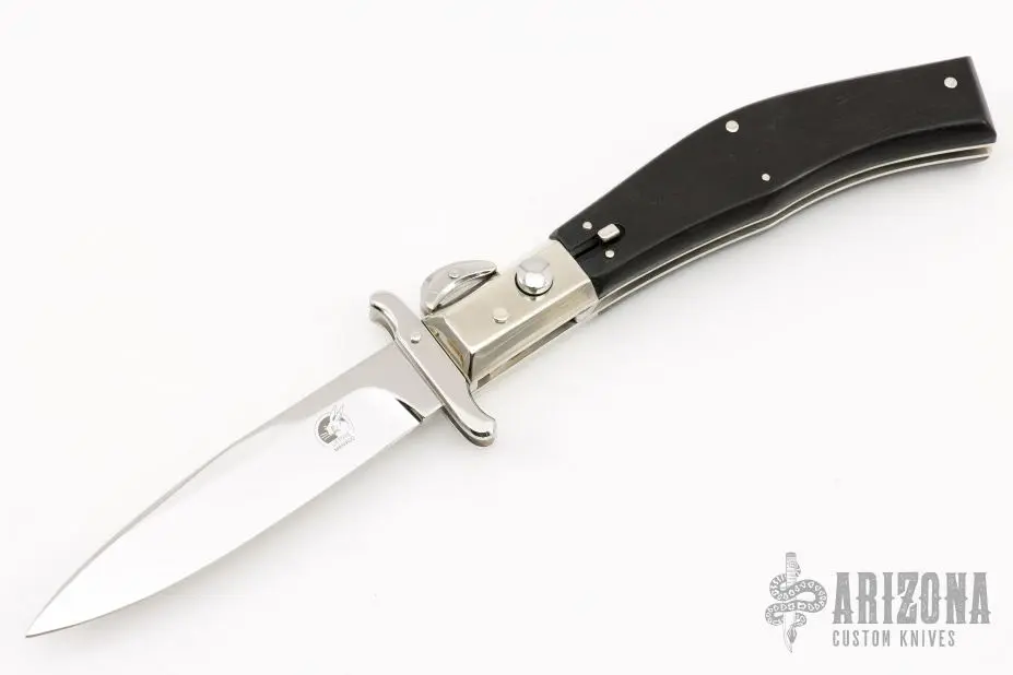 This auto by AGA Campolin (Lepre) feature a mirror polished blade. The handle has nickel silver bolsters, ebony wood scales, safety, nickel silver liners, stainless steel backspacer. Includes a leather slip sheath. Â Has a couple light scratches, otherwise excellent condition. Â