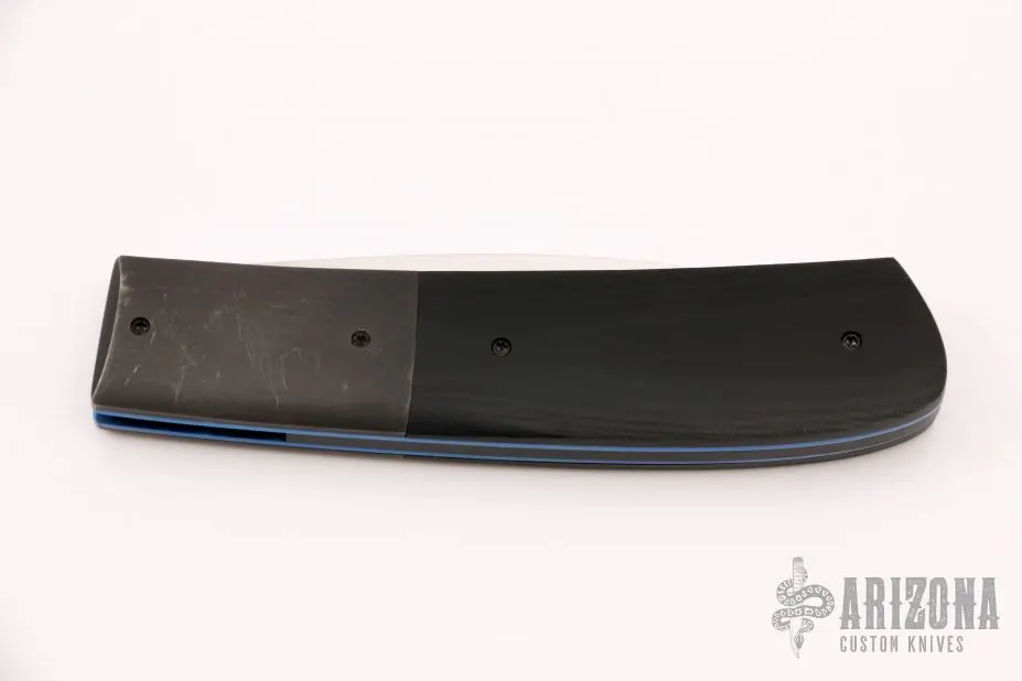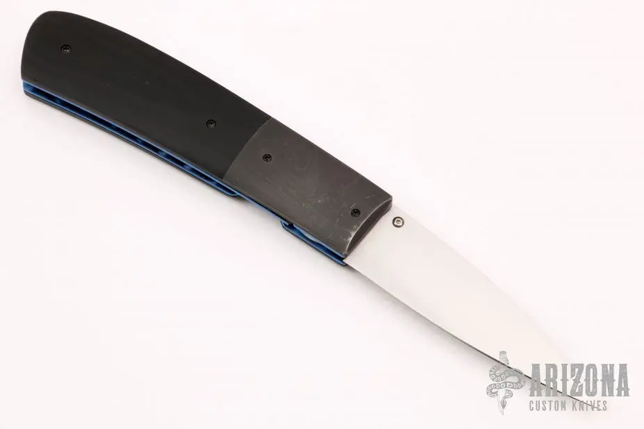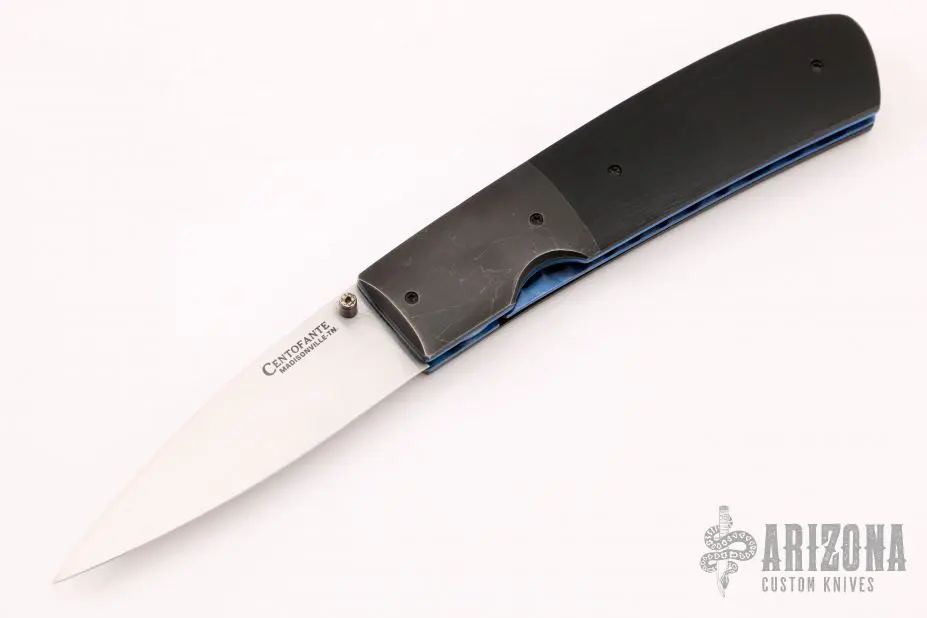 This Linerlock by the late Frank Centofante features a hand rub satin finished blade with single thumbstud. The handle has dovetailed and anodized titanium bolsters, black G-10 scales, anodized titanium liners and a black G-10 backspacer. Nice detent, lockup and blade seating. Comes with a felt case. Has some light scuffs, otherwise excellent condition.