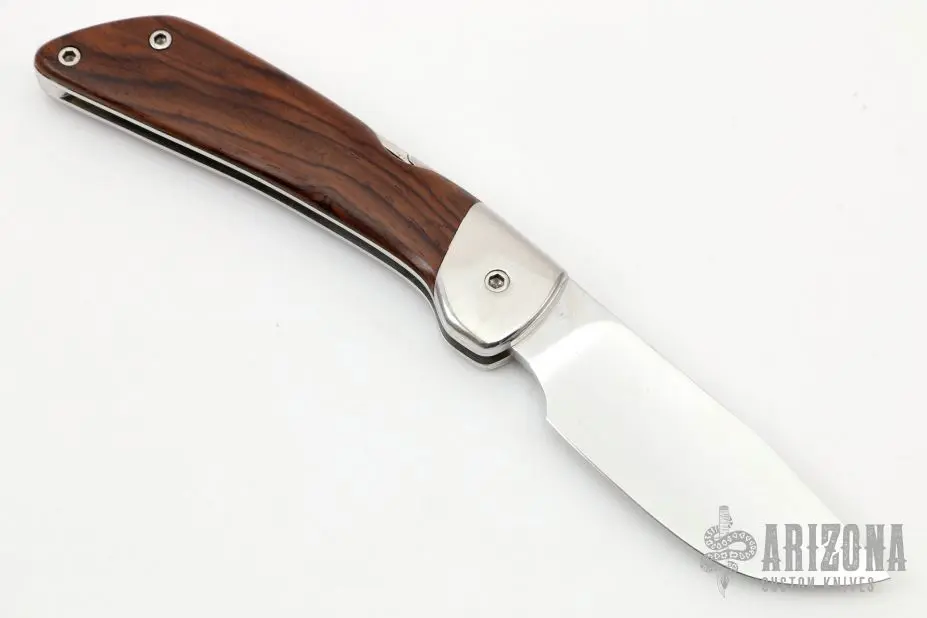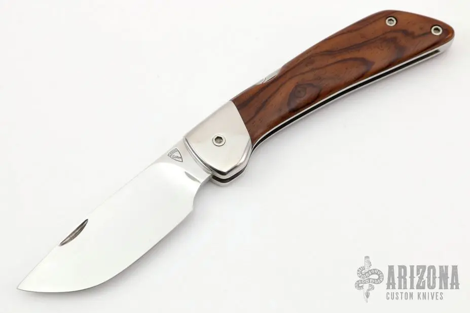 This lockback folder features a high polish blade, high polish bolsters, and a contoured wood handle. Dated 2/79 on back of blade. Has minor scratches on fittings and blade and there is some blade play. Blade Steel: 154 CM
