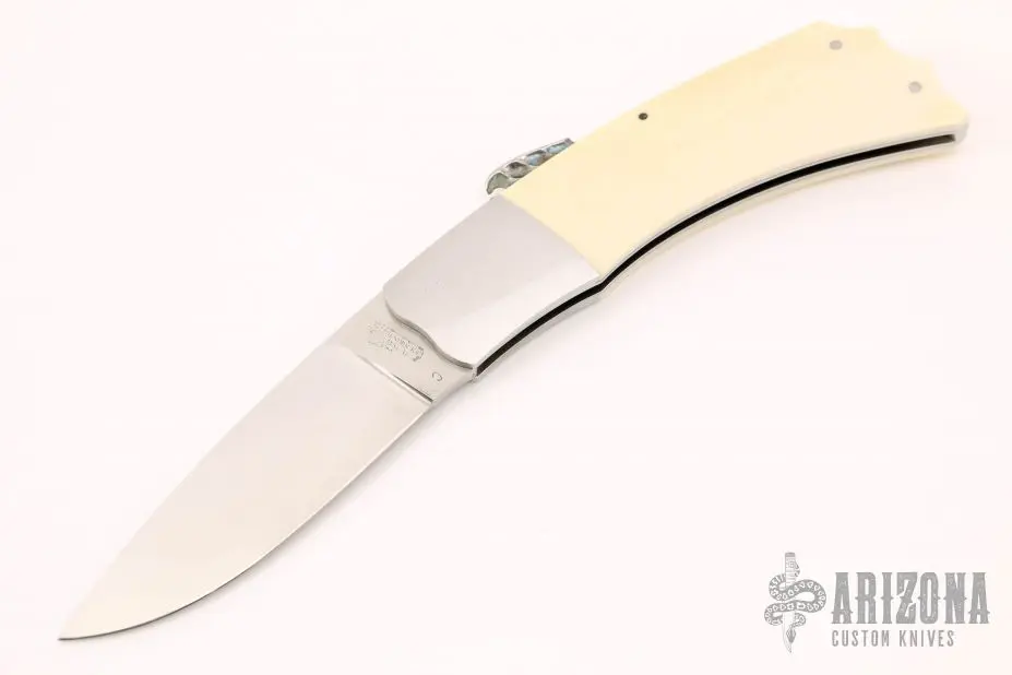 This lockback by Lorenzo Hendricks features a hand rub satin finished blade. The handle has dovetailed nickel silver bolsters, mammoth ivory scales, stainless steel liners and backspacer. Has a few scratches, otherwise excellent condition.