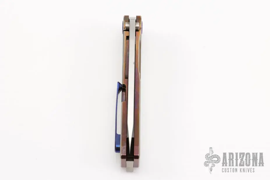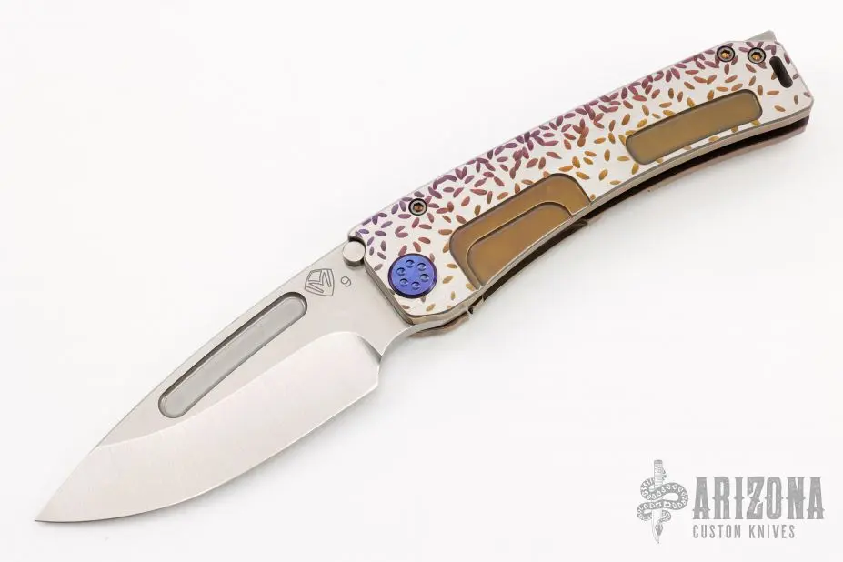 This Marauder from Medford Knife and Tool features a tumbled blade with fullers. The handle has a textured and anodized titanium frame over a steel backspacer and titanium tip up clip. Includes original box, papers and hard case. Excellent Condition. Â