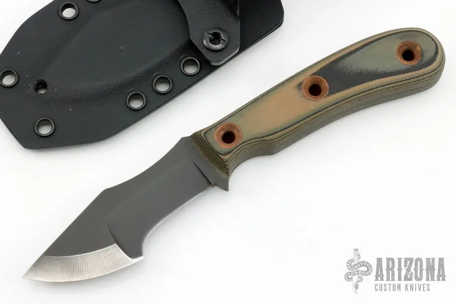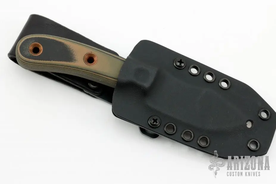 This Micro Tracker by Dave Wenger features a multi-ground blade, .166″ blade stock and 1.240″ blade depth, full tapered tang construction. The handle has SureTouch scales with copper pins. Comes with a kydex sheath. New from maker.