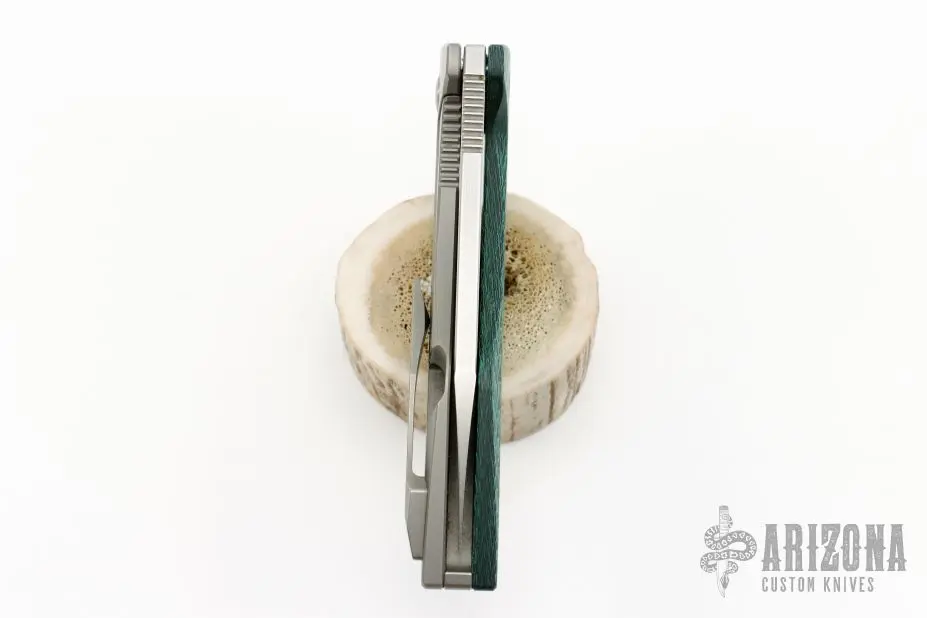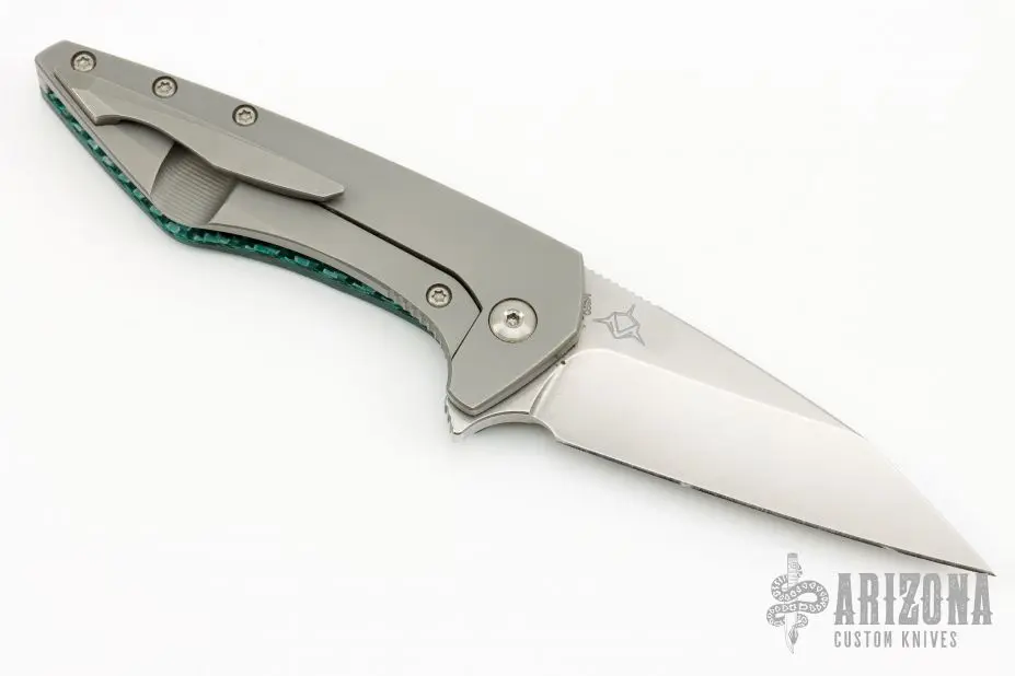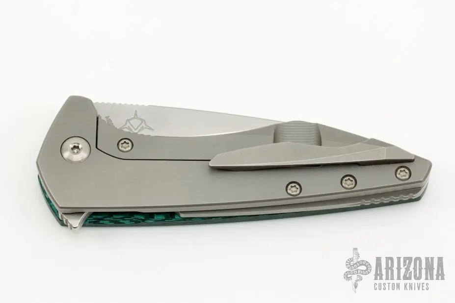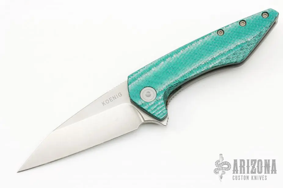 The Koenig Mini-Goblin 3 inch folding pocket knife is a collaboration between Edison Barajas of Sharknivco and Koenig Knives. The Mini-Goblin features a 3 inch stonewashed blade with notched thumbrest and flipper. The handle has a black aqua twill carbon fiber and stonewashed titanium frame with a titanium backspacer and tip up clip with hidden screws. Comes with original box and COA dated 12/17/18. Excellent condition.