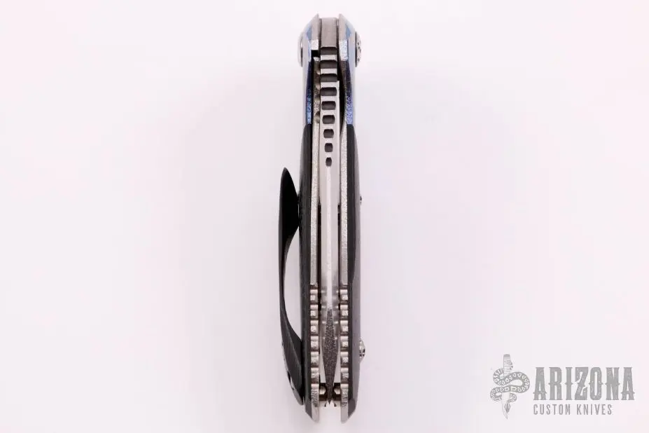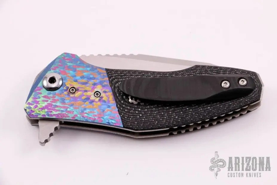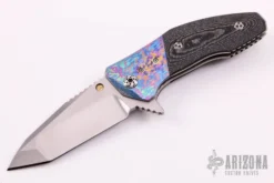This custom Mini Saboteur flipper features a satin finished blade, notched thumbrest and flipper. The handle has black/silver twill scales, multi-color anodized and textured titanium bolsters, textured titanium liners, unidirectional carbon fiber tip up carry pocket clip, and titanium barrel spacers. Flipping requires no wrist movement. Strong lock, nice detent and blade seating is dead center. Great attention to detail. Excellent condition.