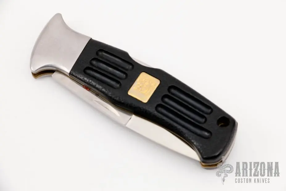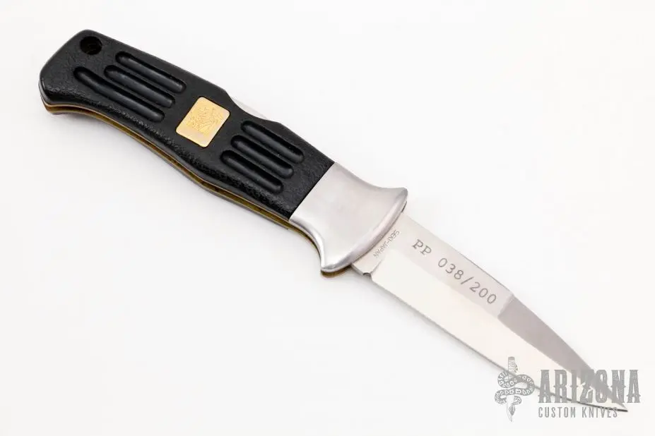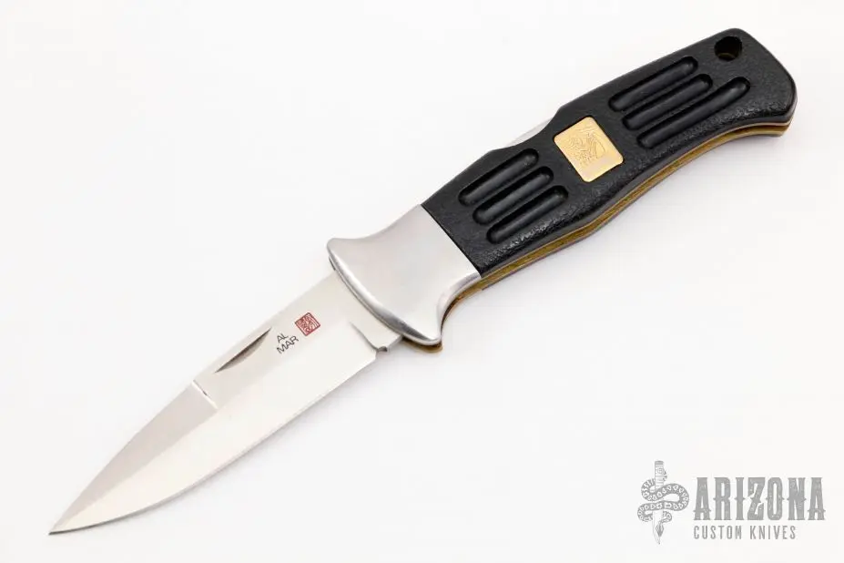 This AL MAR SERE Knife features a satin finished spear point blade with false top edge. The handle has stainless steel bolsters, textured black Neoprene with the RARE and limited GOLD Al Mar Chop inlaid on both sides, brass liners, stainless steel spring and backspacer, lanyard hole. Comes with original nylon pouch. Scuffs and scratches are visible on the blade and handle otherwise the knife is in good working condition.