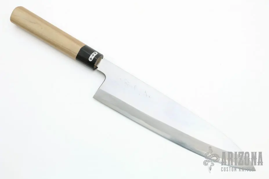 This Deba from Shinichi Watanabe features a stainless clad white steel blade with a hidden tang construction. .227″ Blade Stock. 2.44″ Blade Depth. The handle features horn hilt nicely complemented by a Ho wood grip. This is a fantastic piece that is razor sharp. New from Maker.