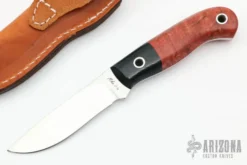 This hunter by Mike Irie features a hand rubbed satin finish blade with notched thumbrest, .123″ blade stock and .875″ blade depth, full tang construction. The handle has black linen micarta dovetailed bolsters and maple scales. Excellent fit and finish. Brown leather sheath. New from maker at the 2022 Blade Show.