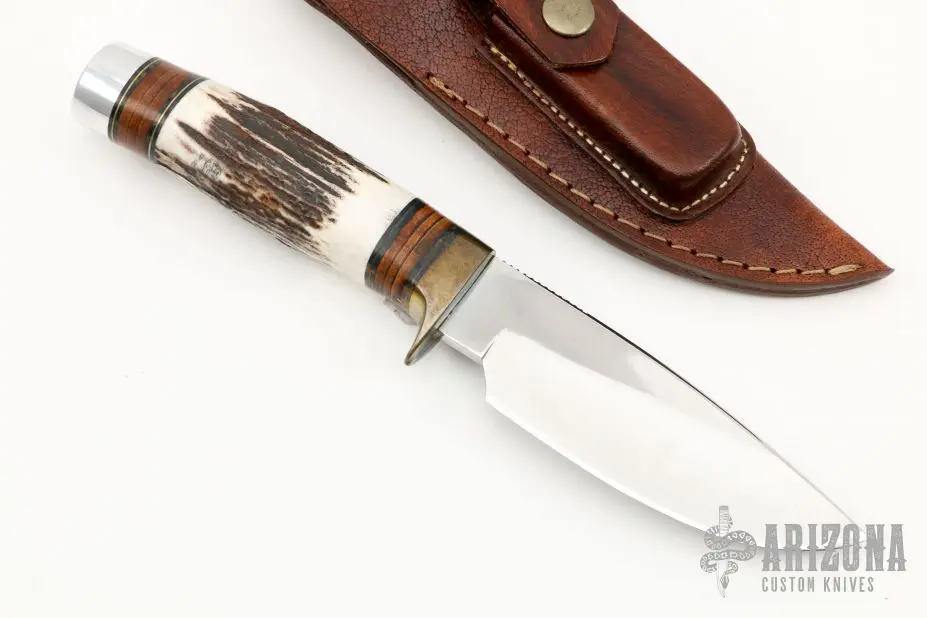The Model 25-5 has a mirror polished blade with notched thumbrest, .197″ blade stock and 1.535″ blade depth, hidden tang construction. The handle brass guard and aluminum pommel, stag grip with stacked leather, black and brass spacers. Comes with brown leather sheath. Has a little patina, otherwise excellent condition.Â