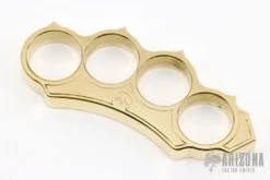 This Model #3, 4 finger brass knuckle by WK21 is made from solid .500” thick 360 Brass. The dimensions are approximately 2” x 4.625” x .5” with 1-inch diameter finger holes. Micro-brushed satin finish (fingerprint resistant). Woody Knuckle design and finishing process. Individually boxed. 100% Made in the USA. New from maker.