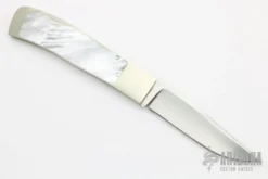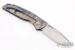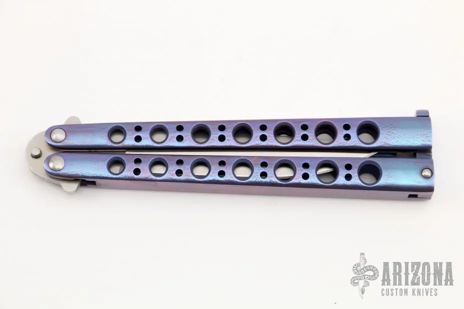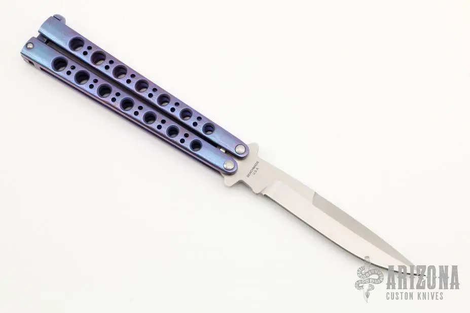 This Model 42A Balisong features a tumble finished partially serrated blade and anodized titanium handles with an orange peel finish. Has T-latch. Includes original sheath. Excellent condition.Â