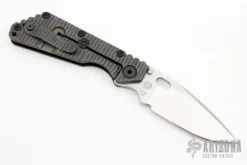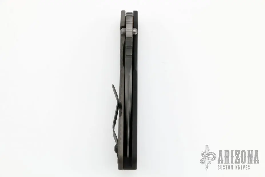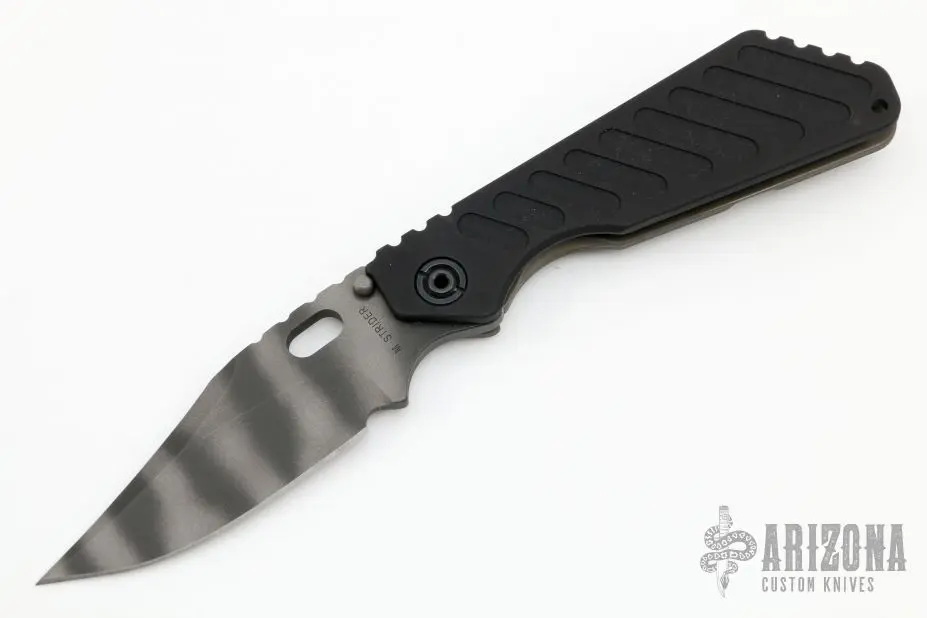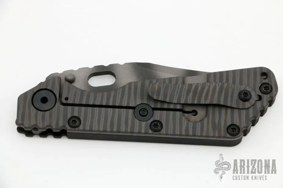 This Mick Strider SMF Bowie framelock folder features a tiger stripe blade with thumbhole and notched thumbrest. The handle has a black aluminum and flamed titanium frame with titanium clip, tip up carry, lockbar stabilizer. Jimping on blade spine. Nice lockup, detent, and blade seating. New condition.