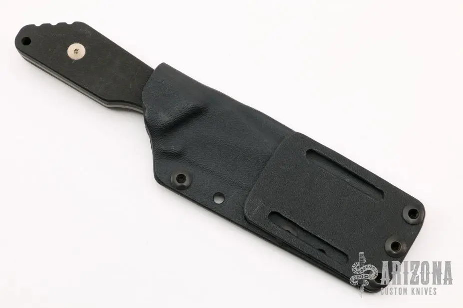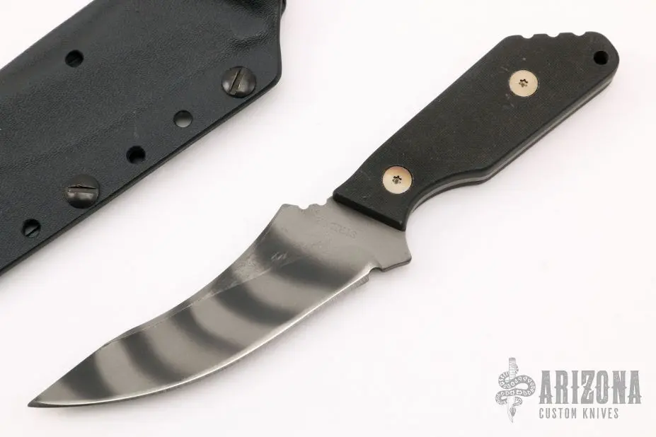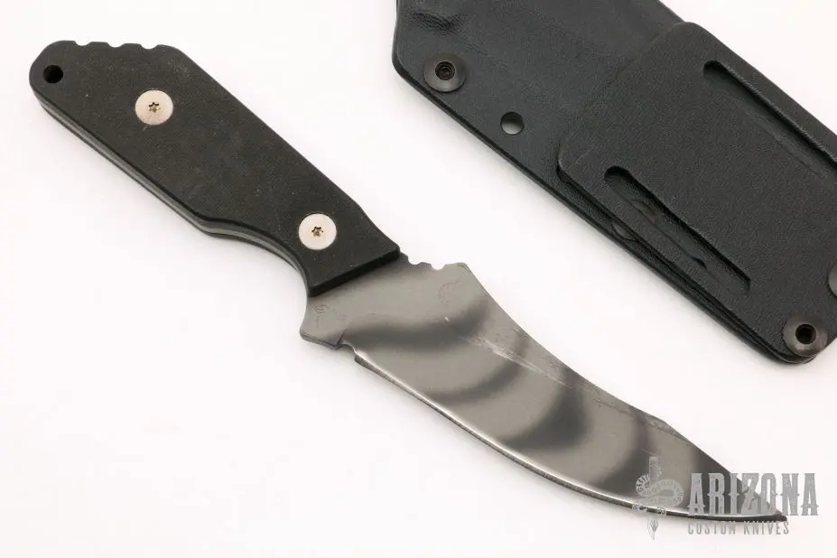 This MV by Strider Knives features a tiger striped blade with .192″ blade stock and 1.580″ blade depth, full tang construction with green G-10 scales. Comes with a kydex sheath with TekLok. Has some scuffs from the sheath, otherwise excellent condition.
