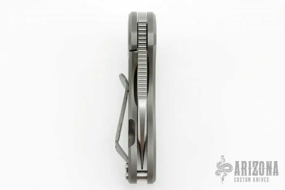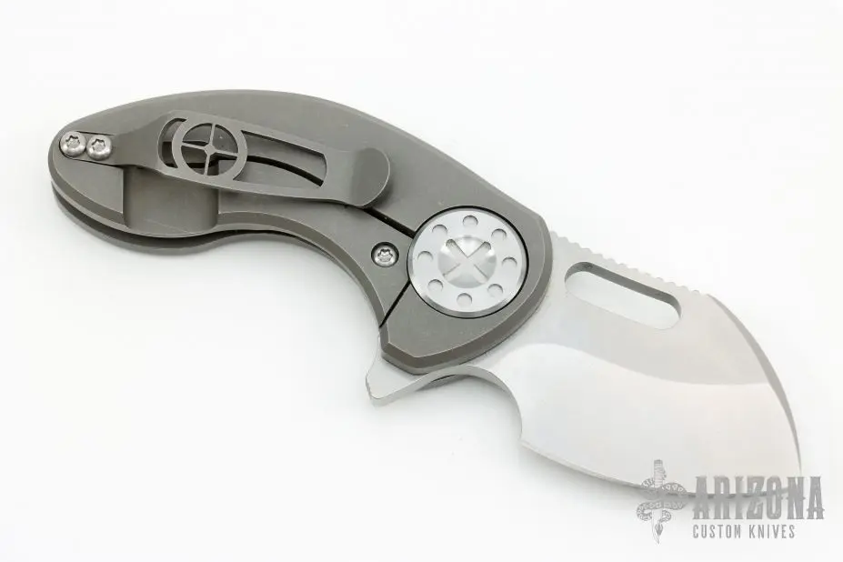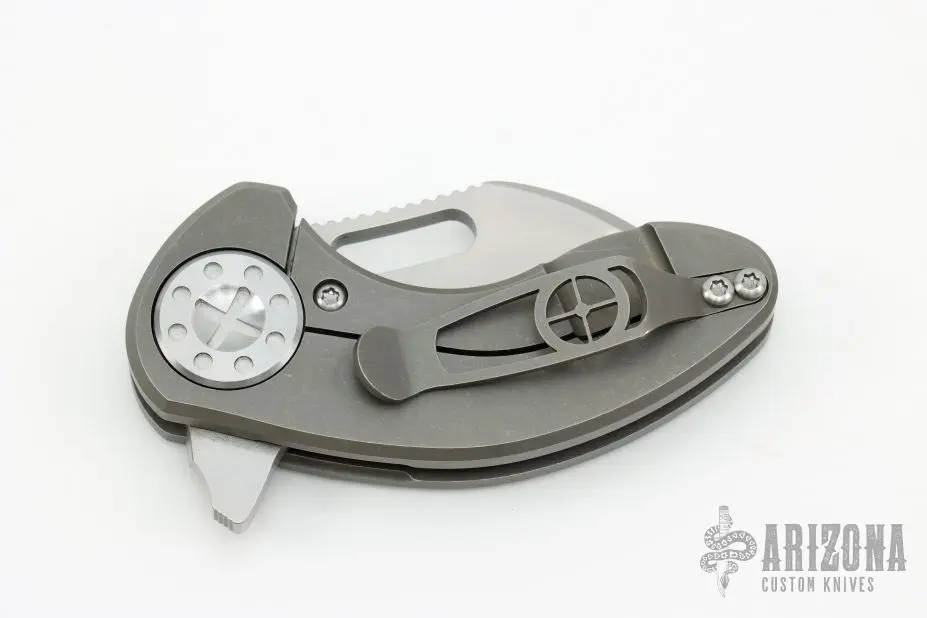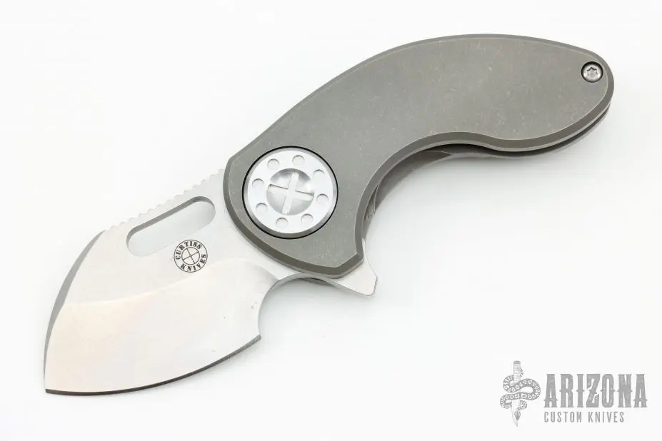 This Nano framelock flipper by Curtiss Knives features a stonewashed blade with notched thumbrest and flipper, and a thumbhole. The handle has a tumbled and anodized titanium frame with cutouts and tip up clip. Stainless steel lock insert. Nice detent, lockup and blade seating. Rides on caged bearings. Excellent condition. Comes with a zippered case.