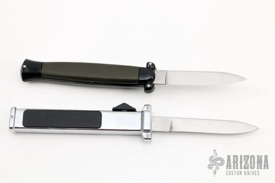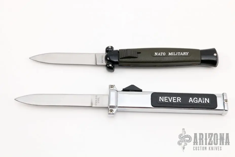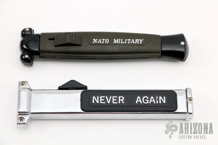 Included is a Never Again auto and a NATO MILITARY auto by The Edge Company. Has some light scratches, otherwise excellent condition.