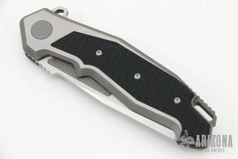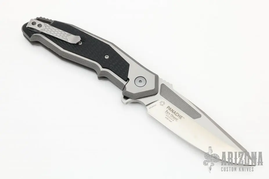 This limited edition Panache model has been outfitted with a stepped titanium handle and a satin finished TCS-XHP steel blade. This special Panache was designed by Ken Onion is and limited to just 550 pieces. Â The Panache is no simpleton’s knife. With a milled titanium hands with milled G-10 inlays, a sturdy frame lock, and 3.75″ of sharpened TCS-XHP steel, you will be checking off your cutting to-do list with ease. The titanium backspacer, which features a lanyard hole, is jimped along with the base of the blade and the flipper tab for a sure open. The pocket flip is for deep, tip-down carry. S/N 073. Includes original box and papers. Excellent Condition. Â