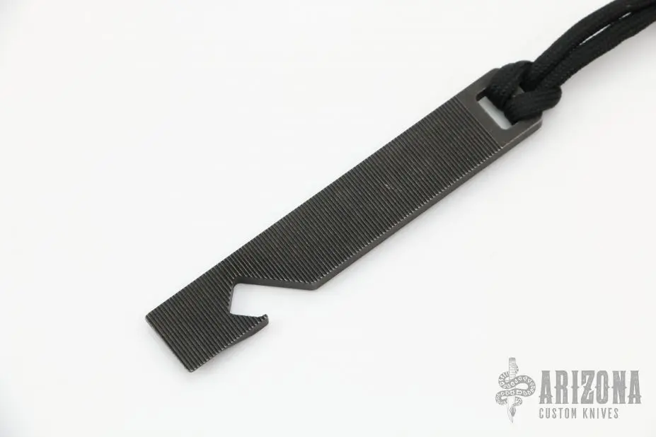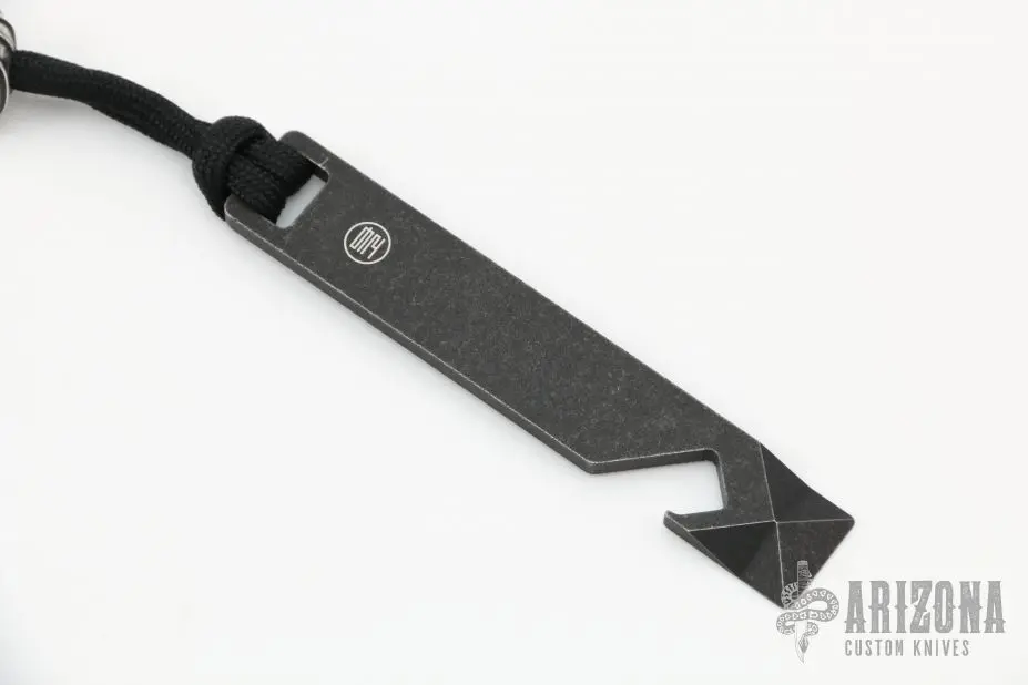 PIKE is a minimal-looking pry bar with many functions. It features three edges for scraping, prying, and opening carton boxes. The rectangular hole will fit quarter-inch bits. One of the unique functions of PIKE is the file on the reverse side, it can be used for light filing and can also be used for honing knife edges. Includes paracord and a simple bead.  Includes COA.  Excellent Condition. Â