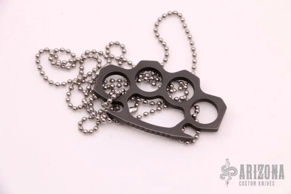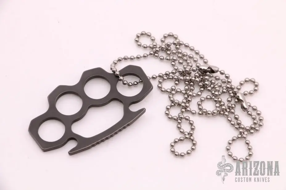 Dark brown titanium miniature knuckles with ball chain necklace. Includes original packaging and papers. New from maker.