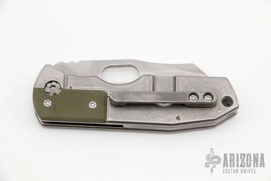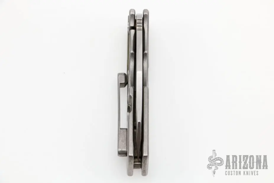 Construction on these folders is something unique to the production game! Everybody makes a 6al4V titanium frame lock, but these bad boys are built as Bolsterlocks! A milled pocket is recessed into the frame and bifurcating the pivot screw. (finally got a chance to use that word!) Peel textured g10 is then machined to fit into that pocket and on the lock side, does double duty as an overtravel stop/lock stabilizing element. Not only cool and unique looking but a mechanically functional part of this knife’s build.