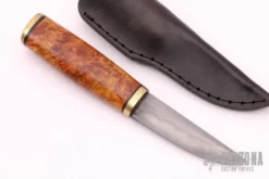 This Raptor by Murad Custom Knives features a hand rub satin finished blade with nice hamon and false top edge, .143″ blade stock and 1.261″ blade depth, hidden tang construction. The handle has an antiqued brass guard and a Japanese Rosewood grip. Comes with a brown leather sheath and COA. New from maker. Â This knife is a take down model and by removing the tang nut you can remove the handle.