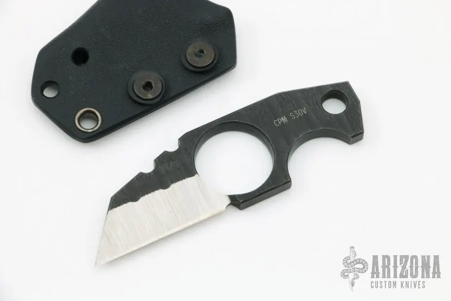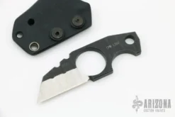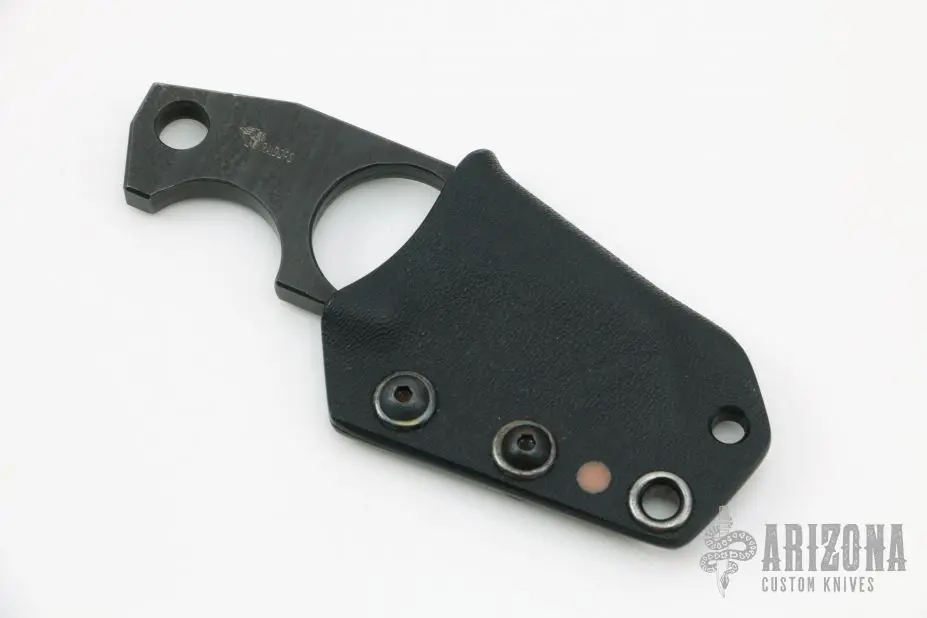 This Raptor by Raid Ops (Nam Duk Kim) features a V-ground, black coated blade with deeply notched thumb rest, 3/16″ blade stock, 1 3/16″ blade depth. 1″ diameter finger hole and deep finger groove. Includes Kydex sheath and Glo-Dot. Great work. Excellent condition.Â
