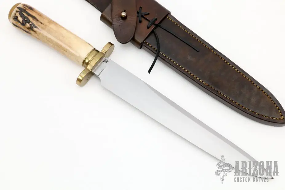 This Bowie by Journeyman Smith Rich McDonald features a hand rub satin finished forged bowie blade with a sharpened top edge, .235″ blade stock, 1.352″ blade depth. Hidden tang construction with brass guard, spacers and butt cap, and a stag grip. Has some small oxidation marks on the blade, otherwise excellent condition. Comes with a brown leather sheath and a zippered case.