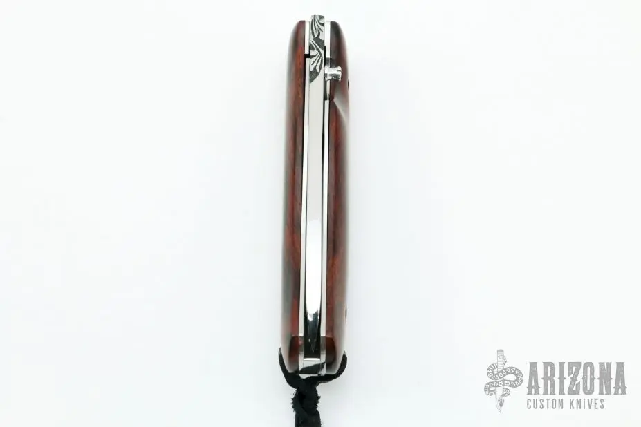 This linerlock folder by Citadel Knives features a drop point blade with polished grinds and forge finished flats and a single fileworked thumbstud. The handle has rosewood scales, polished stainless steel liners and backspacer with lanyard hole. Nice detent, lockup and blade seating. Comes with zippered case. Excellent condition.