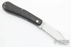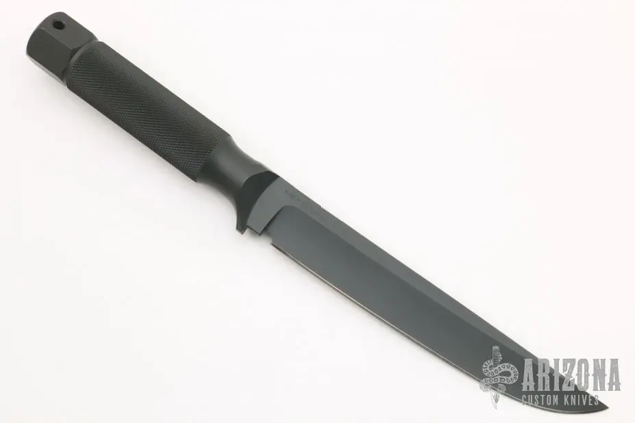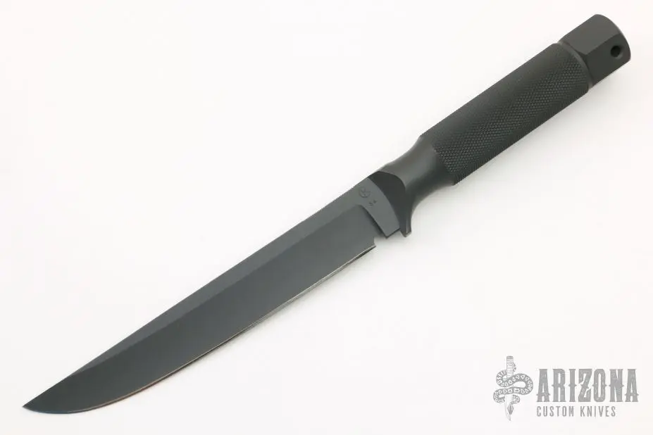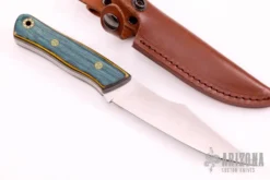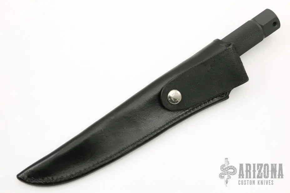 “Perhaps the most overlooked knife in the range and maybe it is the least spectacular looking blade shape but the Sable is, in fact, one of the most practical and versatile of all the blade shapes. The full thickness of material on the back edge makes it a strong knife and the high grind and sweep of the blade offer a perfect utility knife which can double for most skinning tasks.” The blade has .219″ blade stock and 1.088″ blade depth, integral construction. Includes original black leather sheath, replacement box and original COA dated November 21st, 1988. Made in South Africa and is #54. Excellent condition.Â