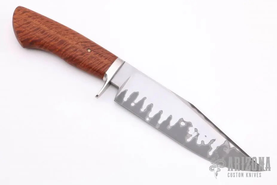 This Bowie by Noi Lom Sak features a hand rub satin finished clip blade with false top edge, .244″ blade stock and 1.684″ blade depth, hidden tang construction. The handle has a stainless steel guard with a curly and quilted wood grip with a brass pin. Excellent condition. Don’t know anything about this maker, but this is a really nice knife.