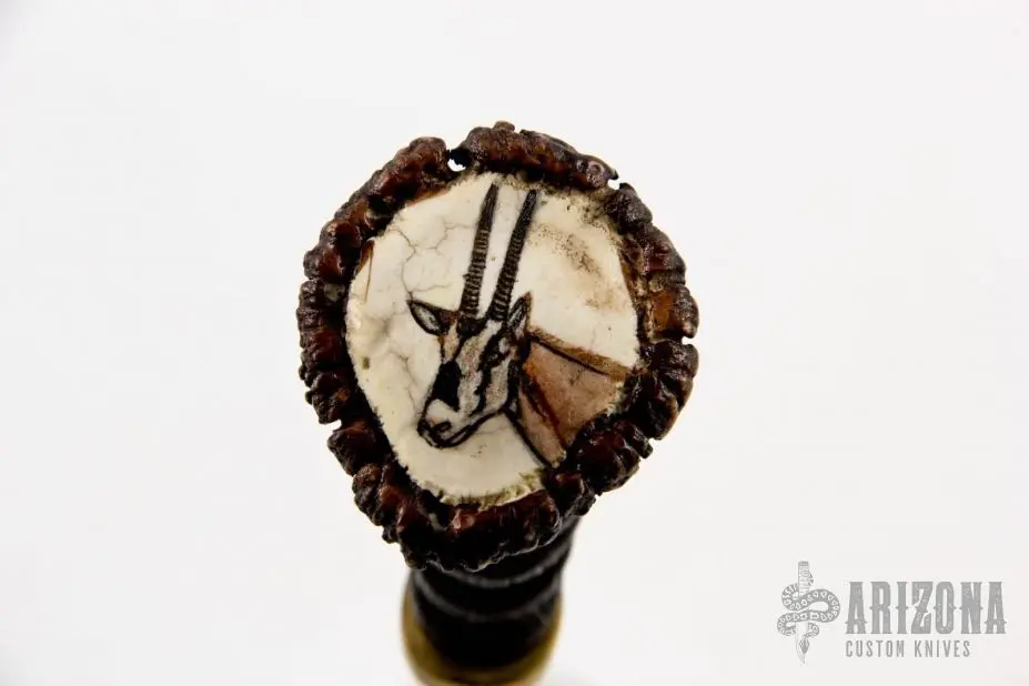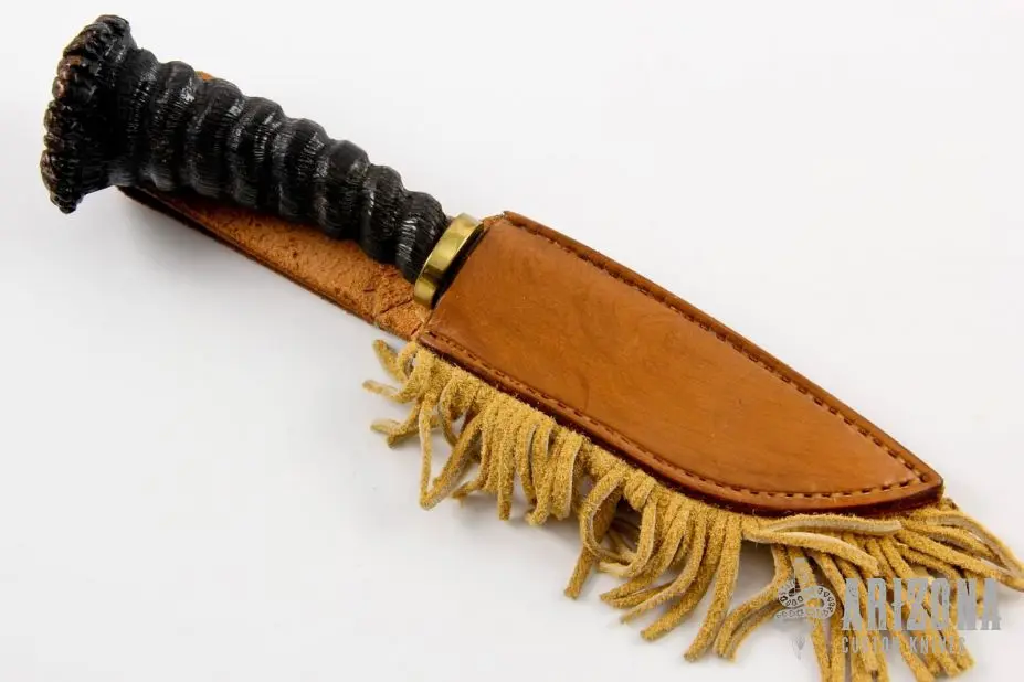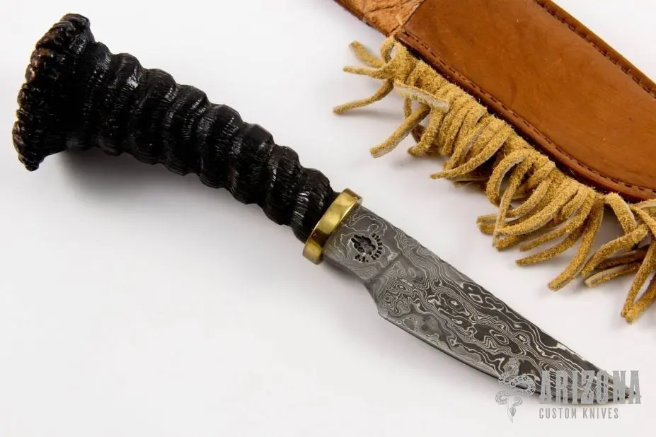 This knife by JA Lonewolf features a Damascus blade with fileworked spine, .220″ blade stock and 1.171″ blade depth, hidden tang construction. The handle has a brass guard, scrimshawed horn grip. Comes with brown leather sheath. Excellent condition.