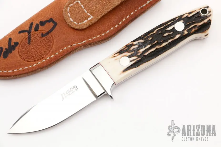 This Semi-Skinner by John Young features a mirror polished blade with .190″ blade stock and .94″ blade depth, full tapered tang construction. The handle has a mirror polished stainless guard, stag scales and red liners. Lanyard hole at butt. Comes with brown leather sheath. Excellent condition.Â