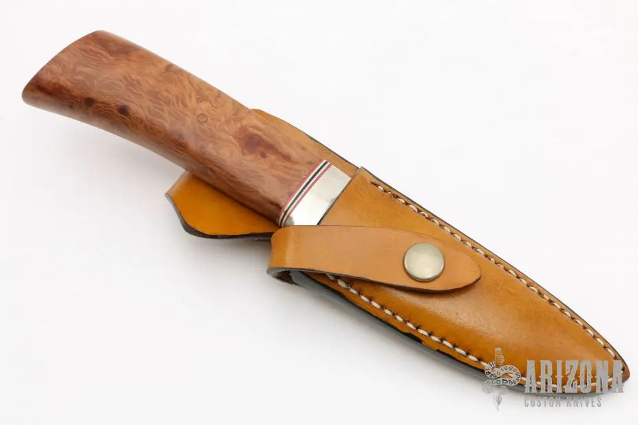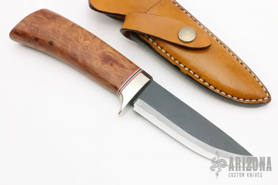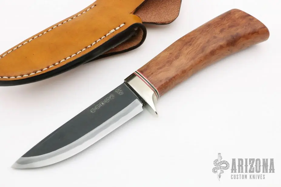 This sheath knife by Shosui Takeda features a Stainless Clad Aogami Super Steel (NAS) blade, .140″ blade stock and 1.205″ blade depth, hidden tang construction. The handle has nickel silver guard, wood grip with red/white/black spacers. Comes with a brown leather sheath. Handle by Moriya. New from maker.