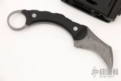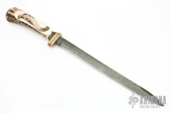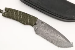 This knife by Josh Gernigliaro features a Damascus blade with .151″ blade stock and 1.274″ blade depth, full tang construction. The handle has wood scales with red liners, filework on the spine and belly of the tang. Comes with a brown leather over kydex sheath and a zippered case. Has some light scratches, otherwise excellent condition.