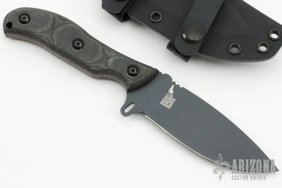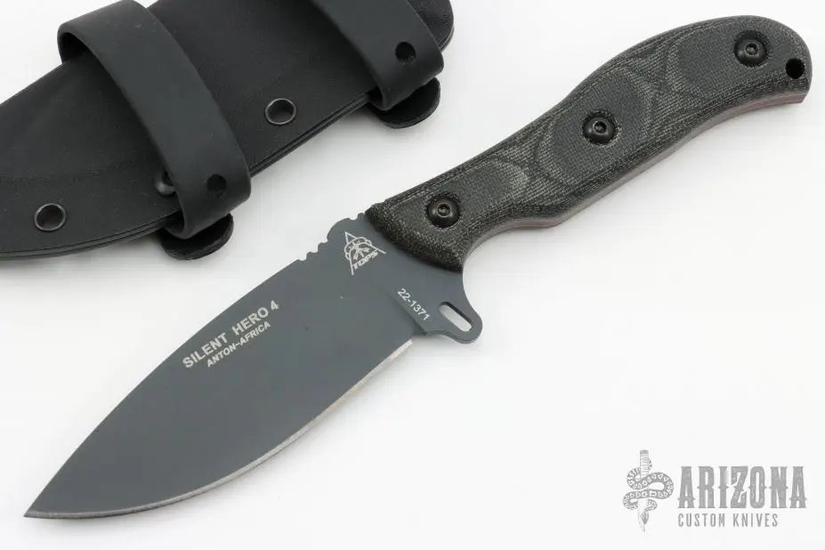 The Silent Hero by Tops Knives a black drop point blade with a notched thumbrest and a full tang construction. Â The handle has micarta scales over red liners. Â Includes a kydex sheath. Excellent Condition. Â