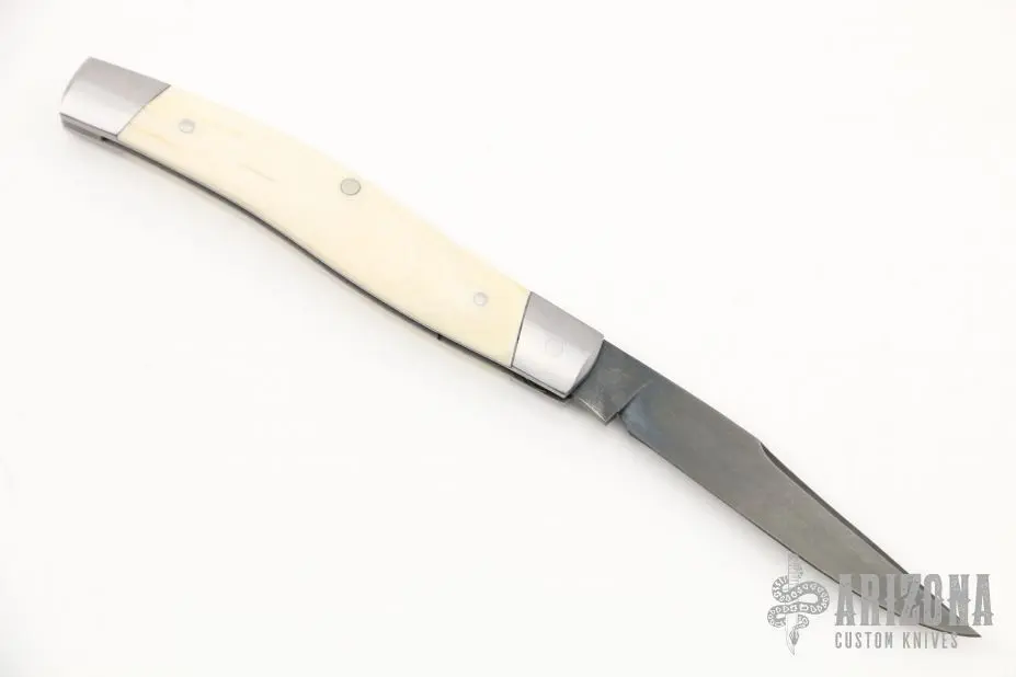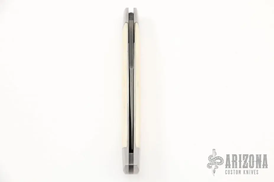 This Slim Serpentine Trapper by Daniel Keown features a blued blade with nail nick. The handle has 416 stainless steel bolsters with integral liners, mammoth ivory covers, blued A2 spring, stainless steel pins. Has half-stop, flush in all positions. Comes with a zippered case. New from maker at the 2022 Blade Show West.