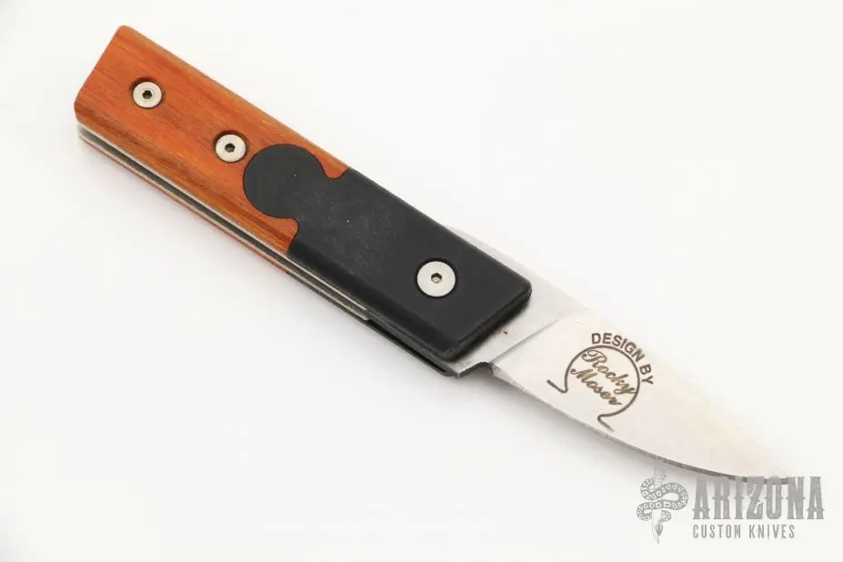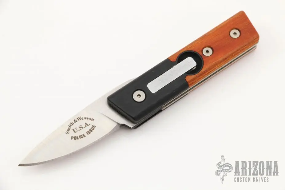 This is a rare collectable Police Issue small auto with satin blade of just 1 7/8″ that may be legal in California.The handle features plastic bolsters with wood scales over steel liners. Â Plastic backspacer. Strong opening action with trigger lever. Â Model SW1230. Â Light scratches are visible on the blade and handle otherwise the knife is in excellent condition. Â