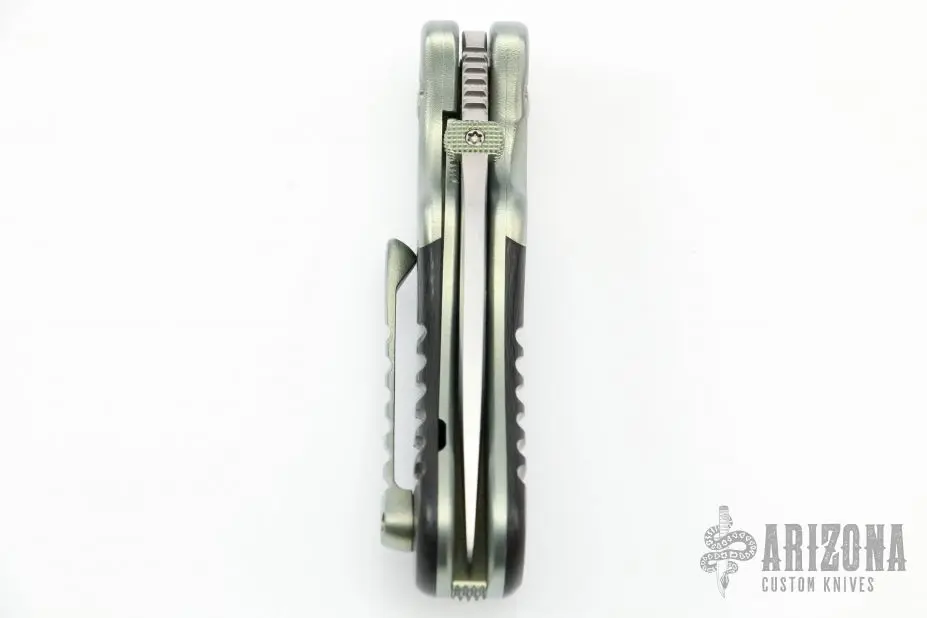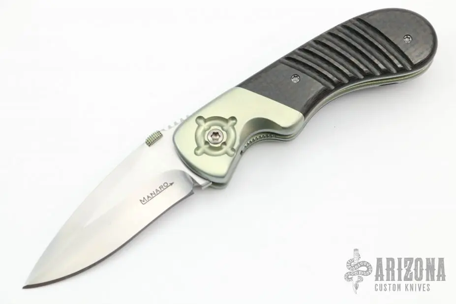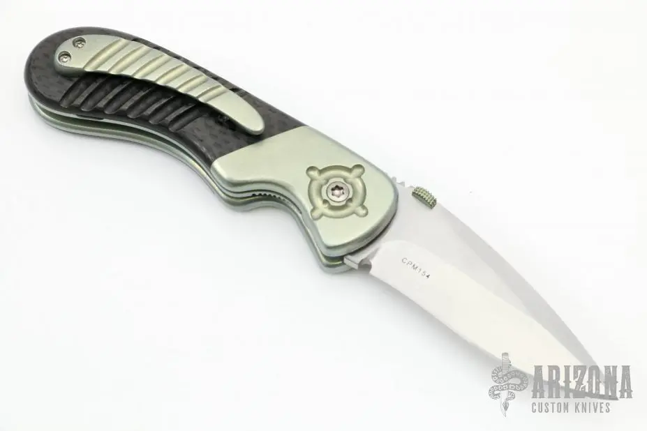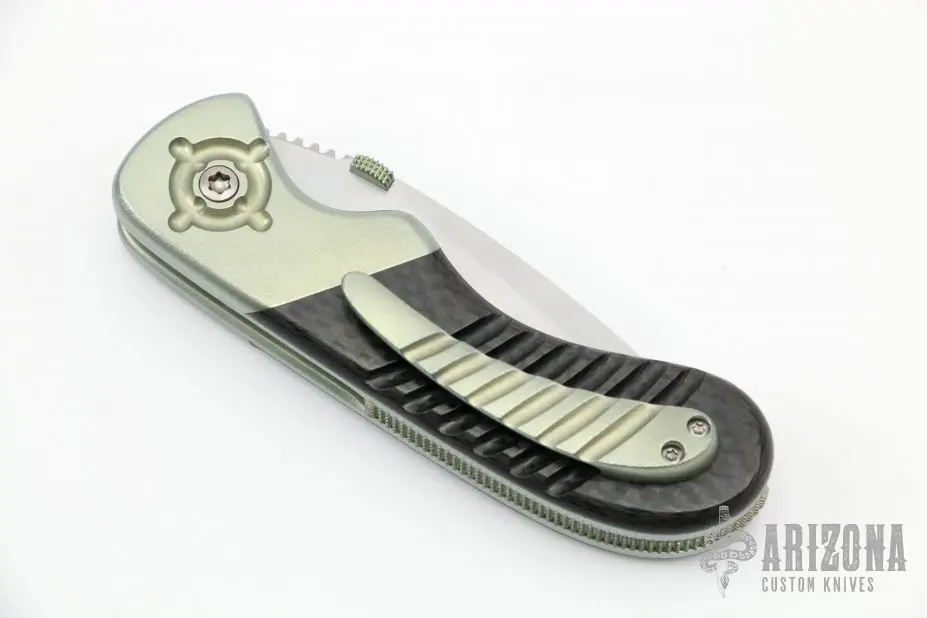 This Small Bullseye from Sal Manaro features a hand rub satin finished recurve blade with swedge, knurled and anodized titanium thumbdisc and notched thumbrest. The handle has dovetailed, anodized and orange peel finished titanium bolsters, carbon fiber scales, orange peel finished and anodized titanium liners and checkered titanium backspacer, tip up titanium clip. Smooth action. Nice blade seating, detent, and lockup. Excellent condition. Comes with a zippered case.