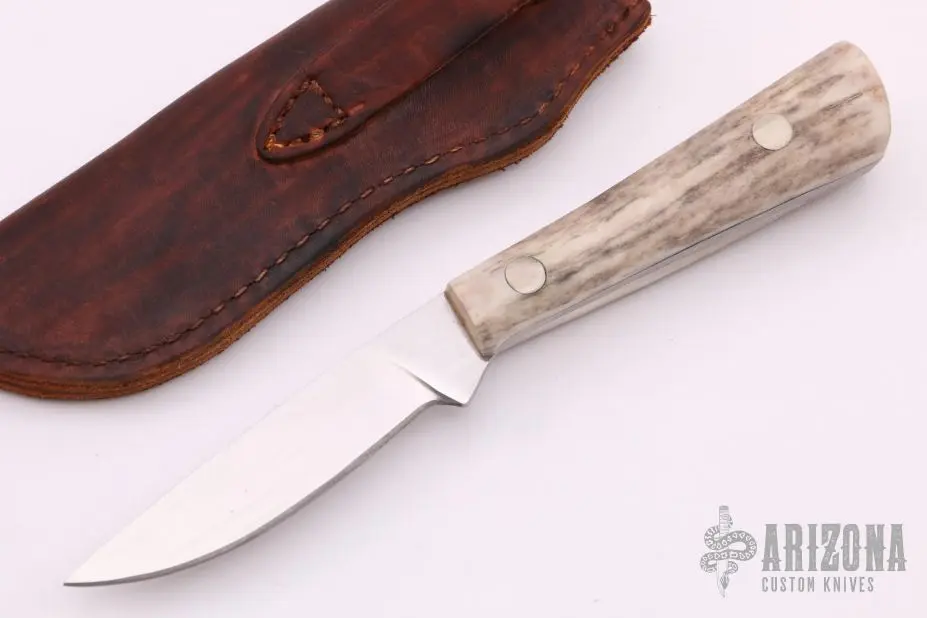 This small hunter by D Fisher features a hand rub satin finished blade with .102″ blade stock and .753″ blade depth, full tang construction. The handle has stag scales. Comes with a brown leather sheath. Has a few light scratches, otherwise good condition. Has zippered case.